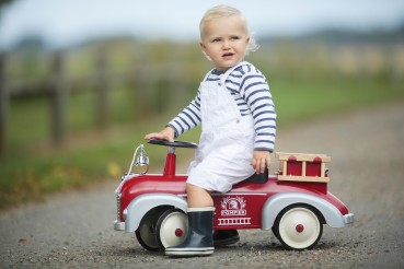 Das Rutschauto Feuerwehr ist sehr stabil: sein Metallrahmen und seine Gummireifen sorgen dafür. Die Kotflügel verleihen ihm einen Touch von Retro-Chic.