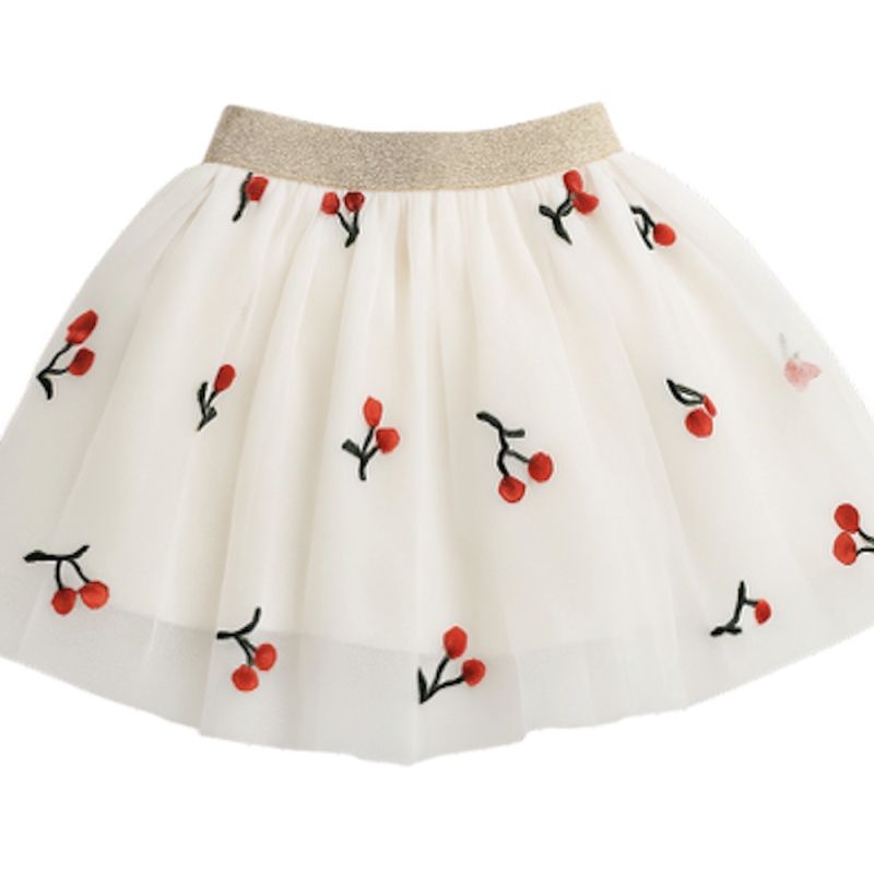 Ein Tüllrock in einem schönen warmen Weiß – dekoriert mit kleinen, verspielten Kirschen, die bei jedem Schritt tanzen. Perfekt sowohl für Geburtstagsfeiern als auch für alltägliche Magie. Der Rock hat ein Gummiband an der Taille und viele Drehungen – bereit zum Drehen. Onesize (passt von ca 98-116)