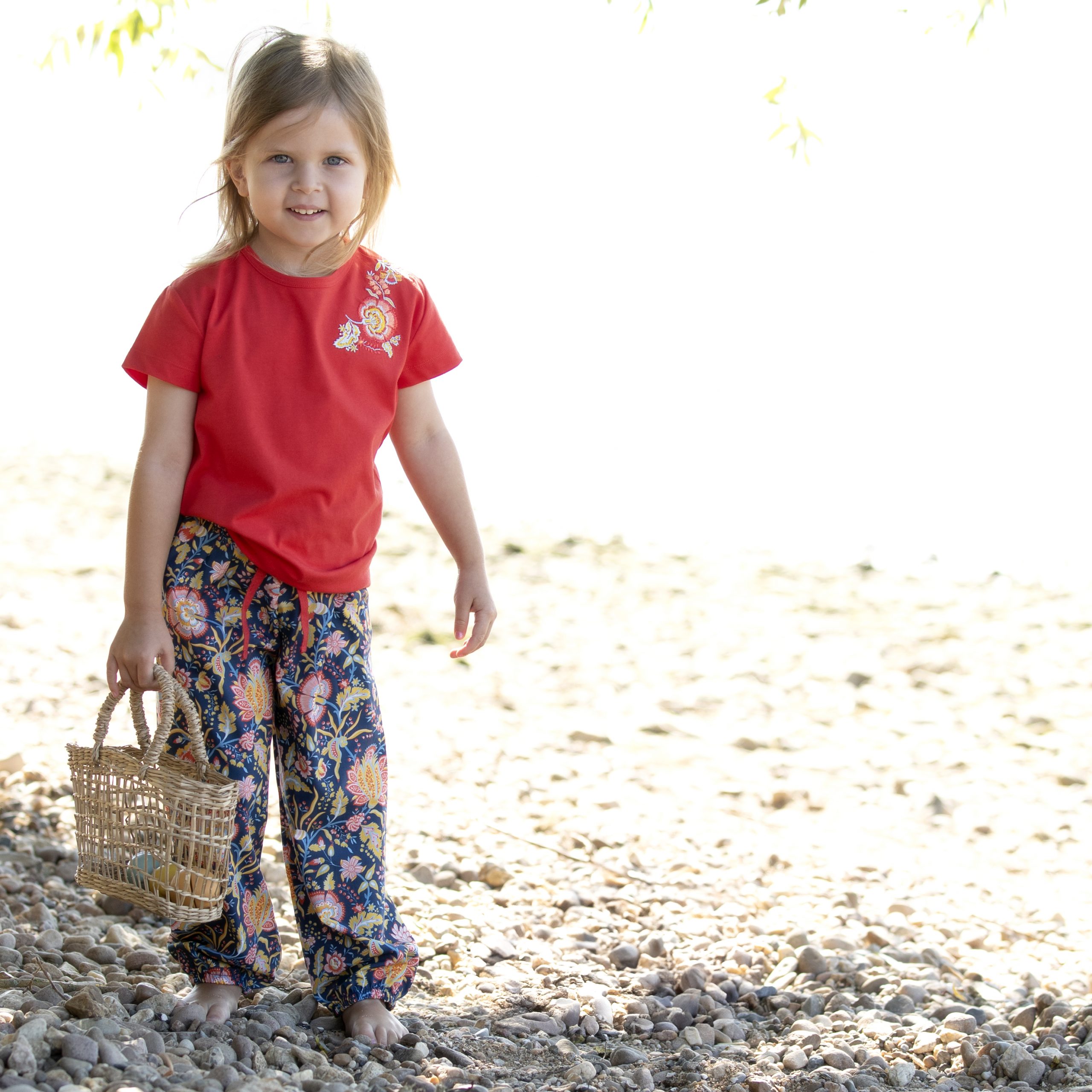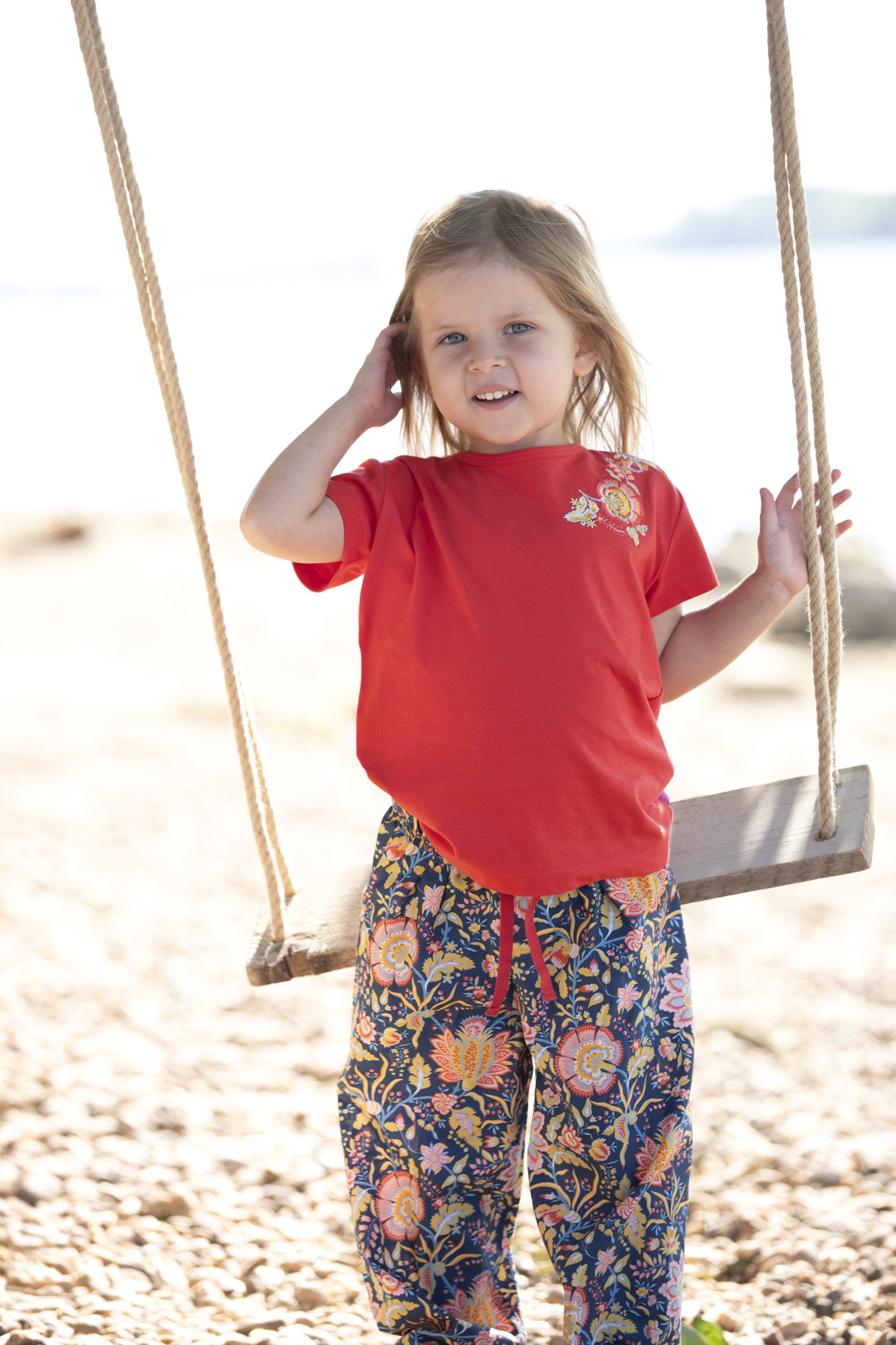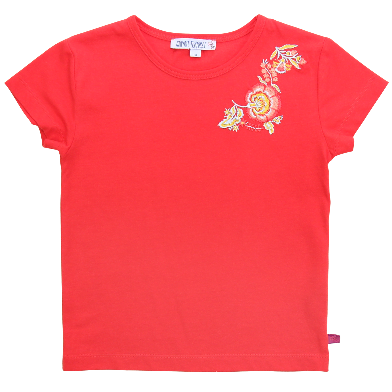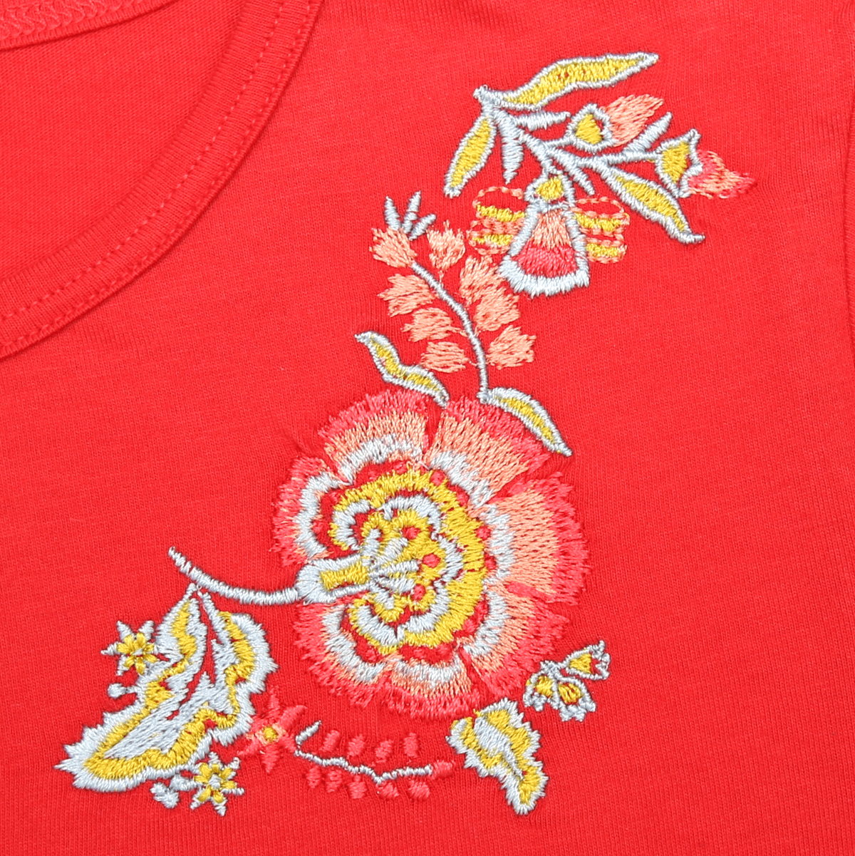 Dieses hübsche T-Shirt in leuchtendem rot bezaubert mit seiner hochwertigen Blumenstickerei am Ausschnitt.