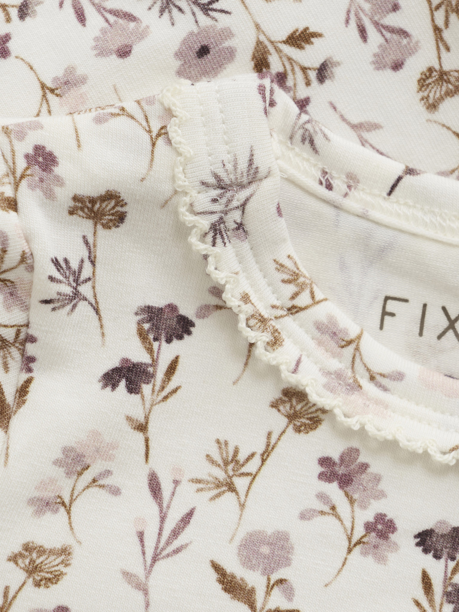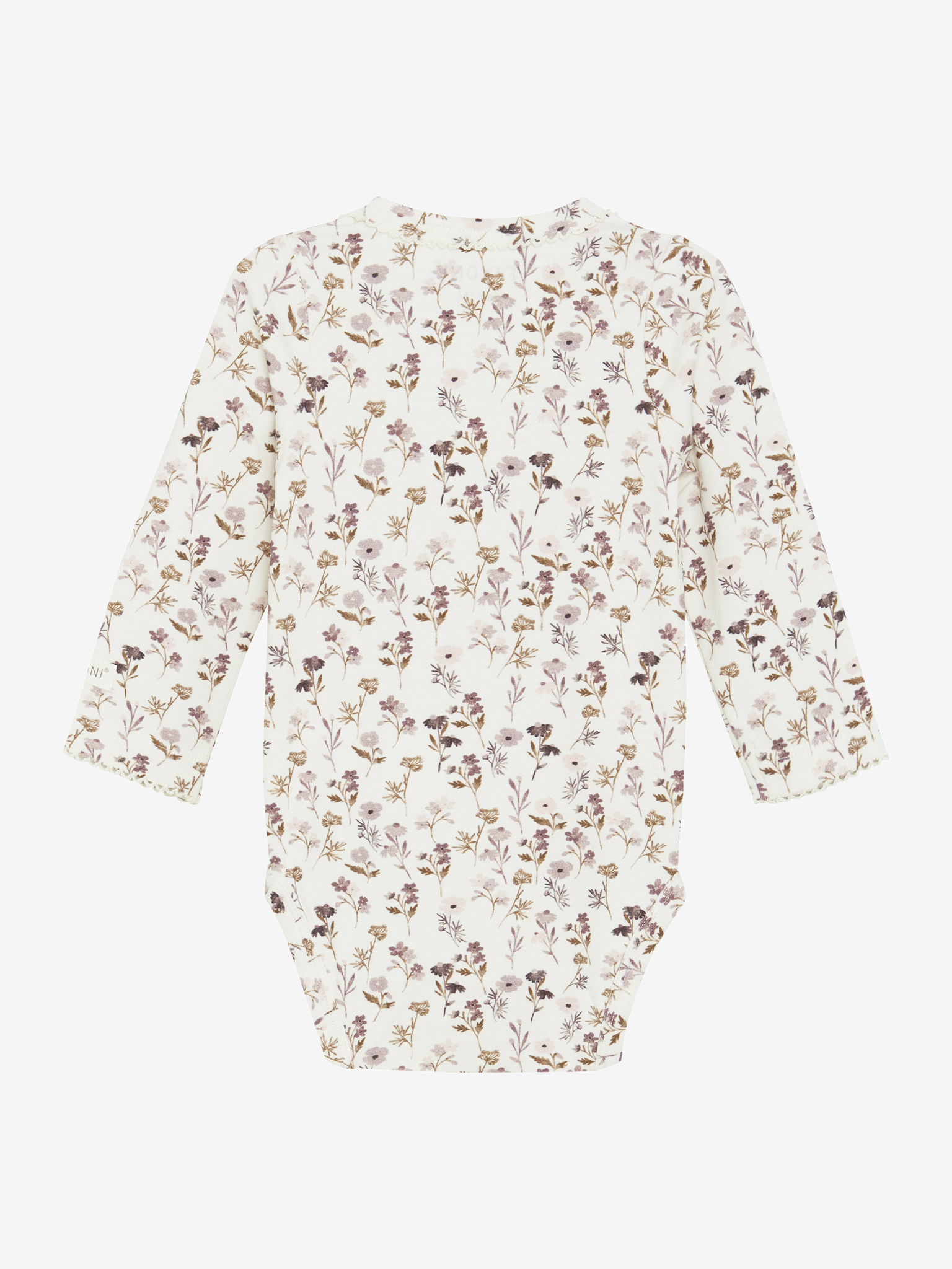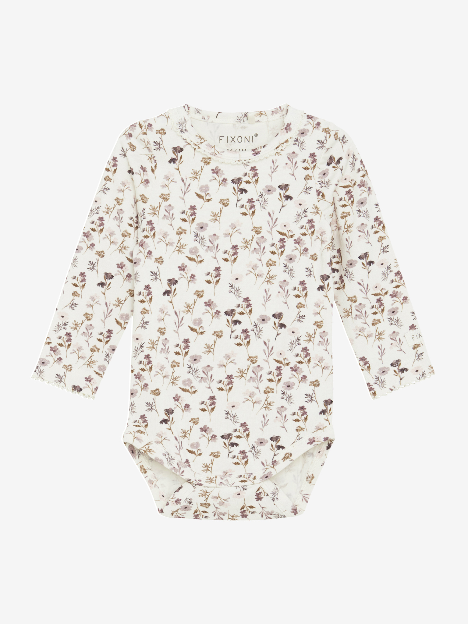 Weicher, langärmeliger Body mit Allover-Print von FIXONI. Der Body wird mit Druckknöpfen an der Schulter und zwischen den Beinen geschlossen. Dieses Produkt enthält TENCEL™-Fasern. TENCEL™ ist eine eingetragene Marke der Lenzing AG.