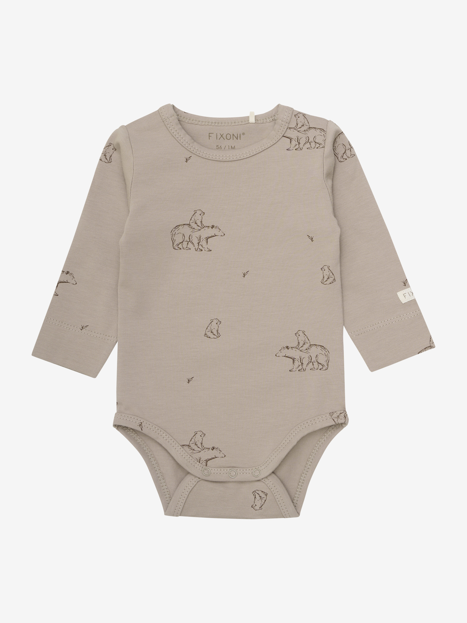 Langärmliger Body von FIXONI. Der Body lässt sich vorne und zwischen den Beinen mit praktischen Druckknöpfen öffnen, sodass er leicht an- und ausgezogen werden kann. Zertifiziert gemäß GOTS – organic CERES-0366.