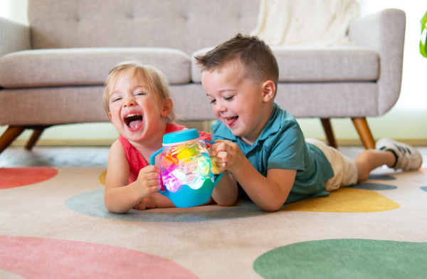 Dieses Produkt benötigt 3 AAA-Batterien (nicht im Lieferumfang enthalten). Diese Batterien können über den verschraubbaren Boden ausgetauscht werden und müssen von einem Erwachsenen ausgetauscht werden. Wir empfehlen, das Sensorik-Spielglas nach jedem Gebrauch zu leeren, um die Lebensdauer der Batterien zu verlängern.