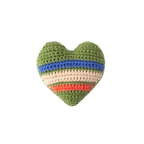 Handgehäkelte Rasseln verpackt in einem schönen Baumwoll-Geschenkbeutel.