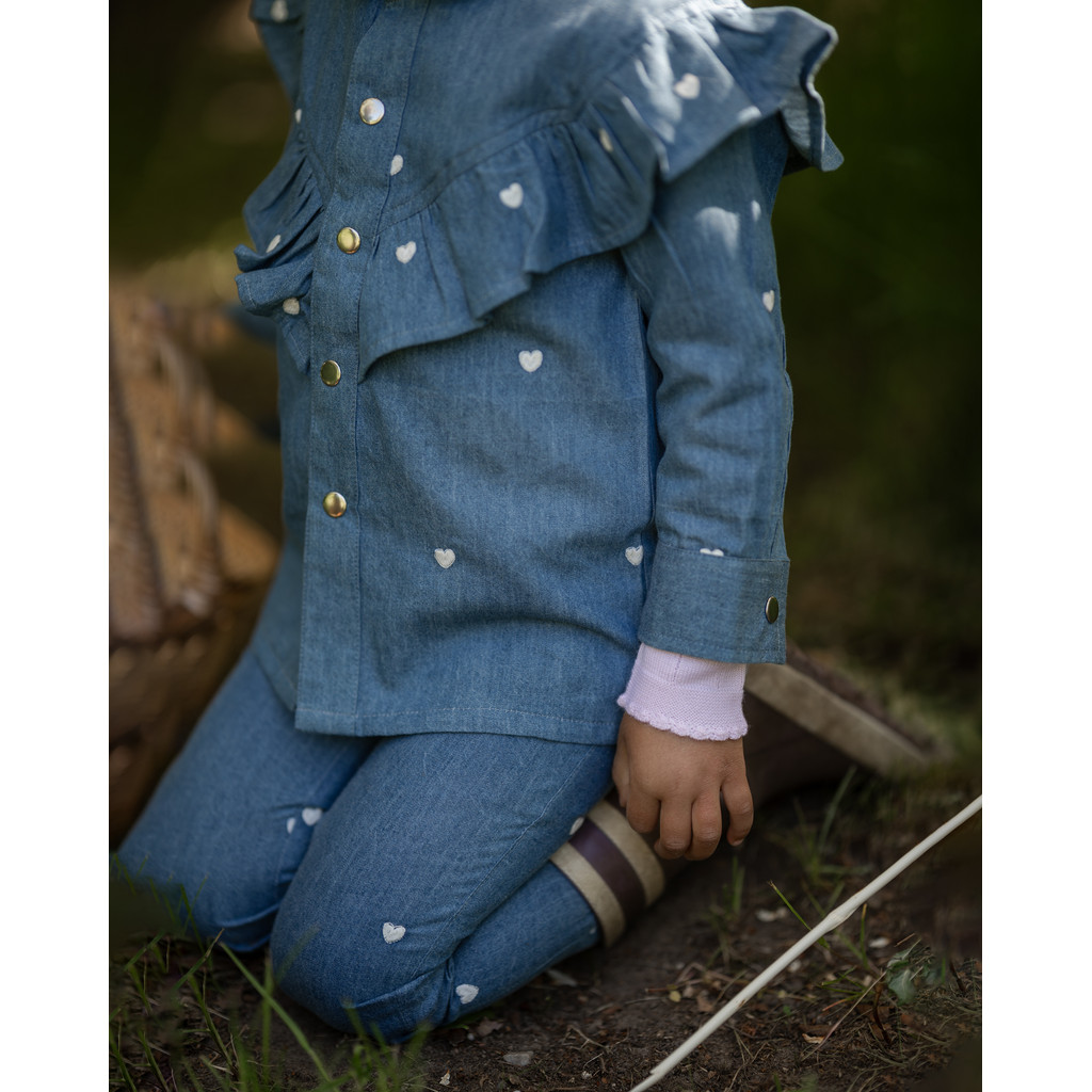 Diese niedliche Kinderhose von Hanevild, gefertigt aus weicher Baumwolle. Die Hose hat ein klassisches Jeansblau mit kleinen bestickten weißen Herzen, die überall verteilt sind, was einen süßen und verspielten Look erzeugt. Sie haben einen elastischen Bund für eine bequeme Passform und zwei Seitentaschen für zusätzliche Praktikabilität.