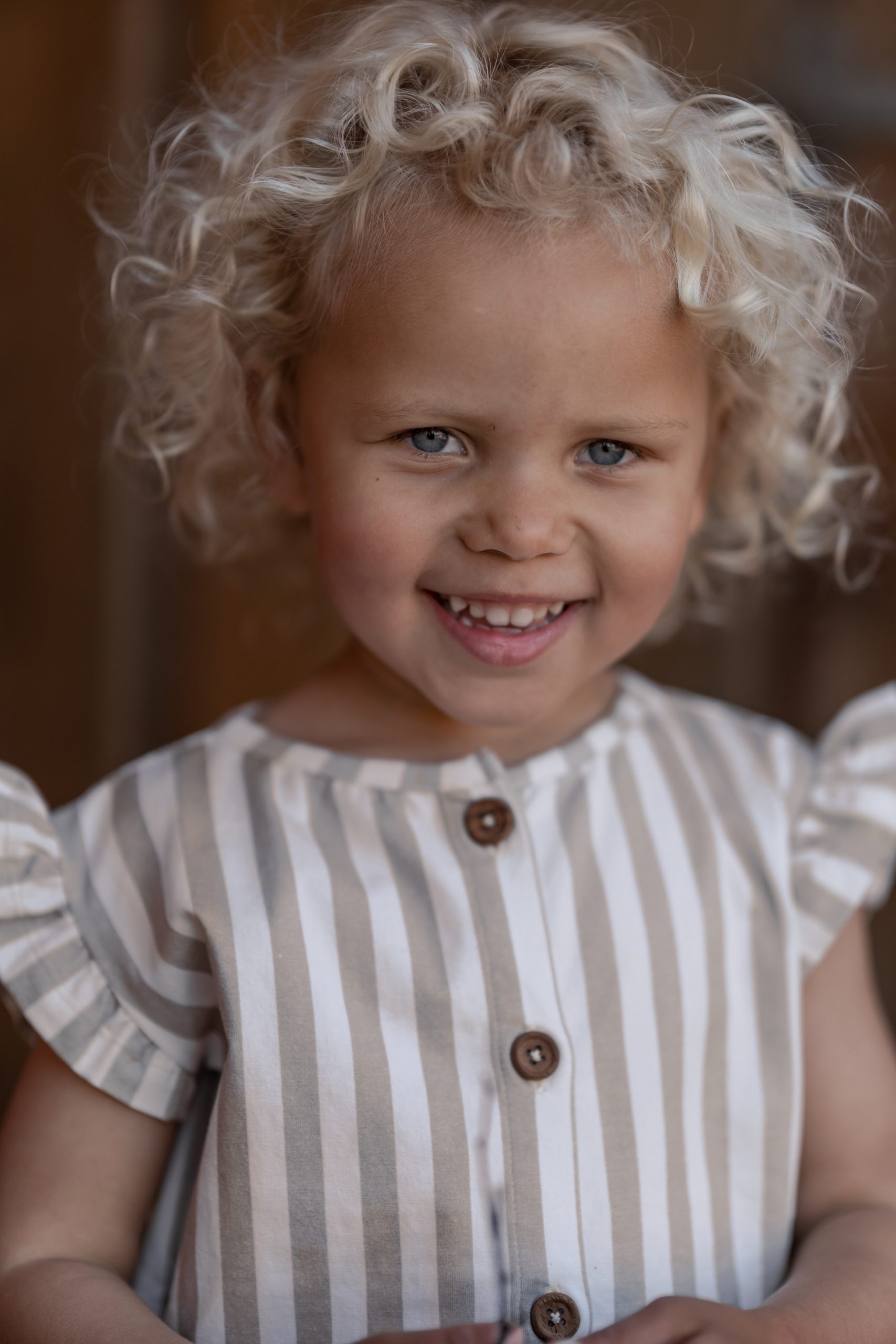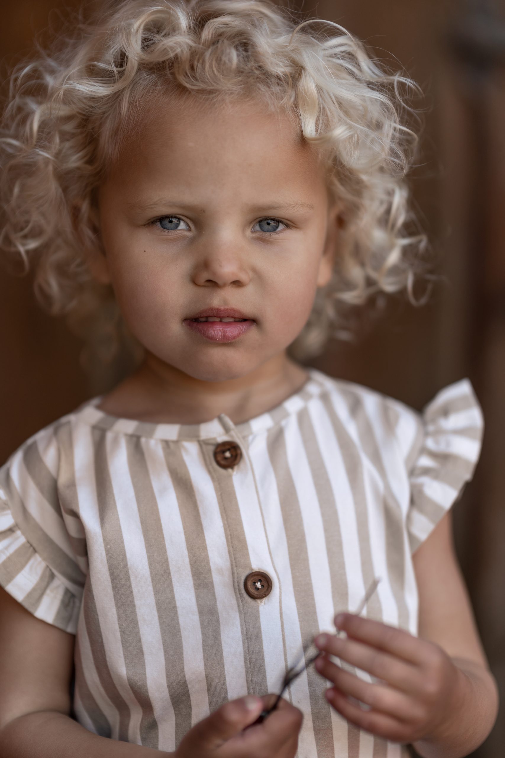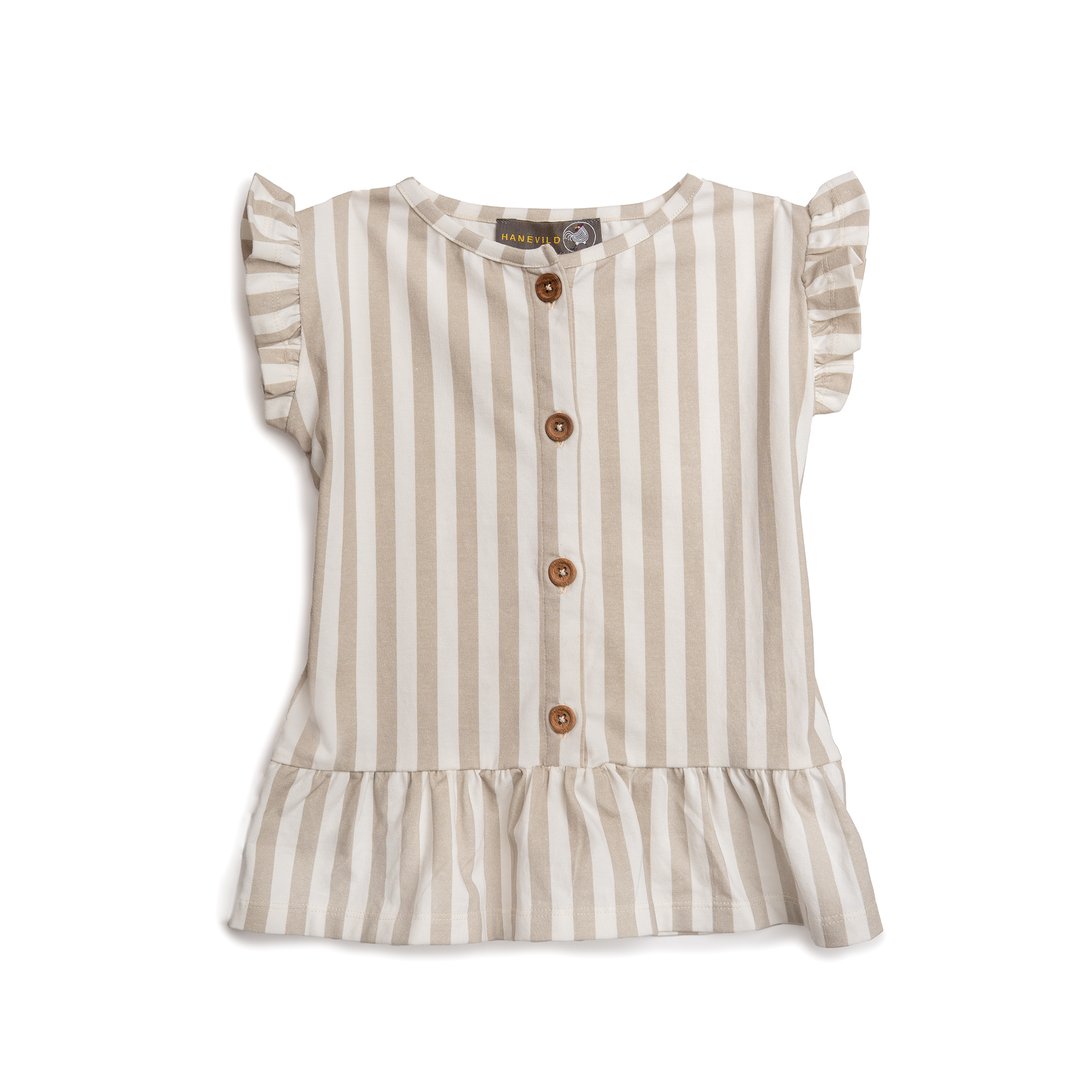 Dies ist eine ärmelloses Shirt für Kinder von Hanevild. Das Shirt zeigt durchgehend ein Streifenmuster, das eine dezente dekorative Textur verleiht. Er hat einen runden Ausschnitt mit Rippenkante und zwei Holzknöpfe vorne für ein einfaches Anziehen. Das herausragende Detail sind die gerüschten Ärmel, die dem Shirt eine charmante und feminine Note verleihen. Ideal, um sie in Schichten zu tragen oder an wärmeren Tagen allein zu tragen.