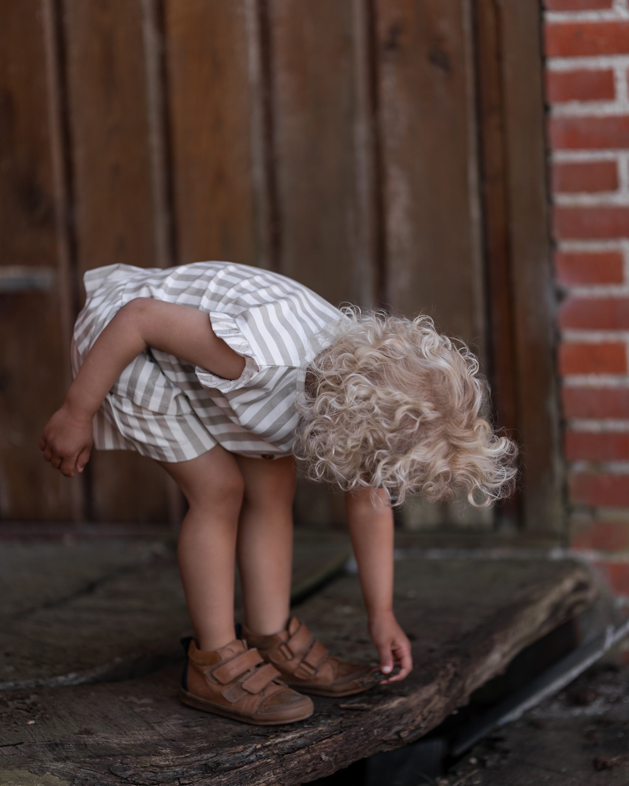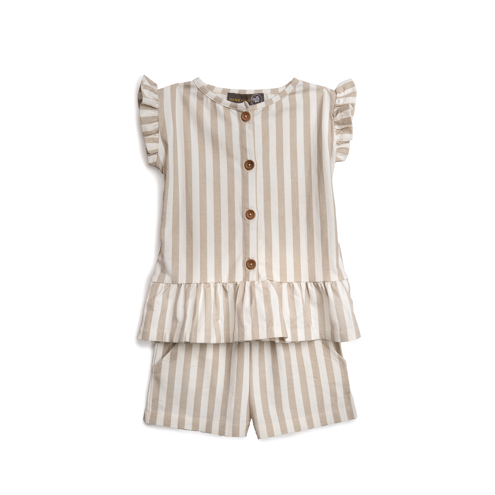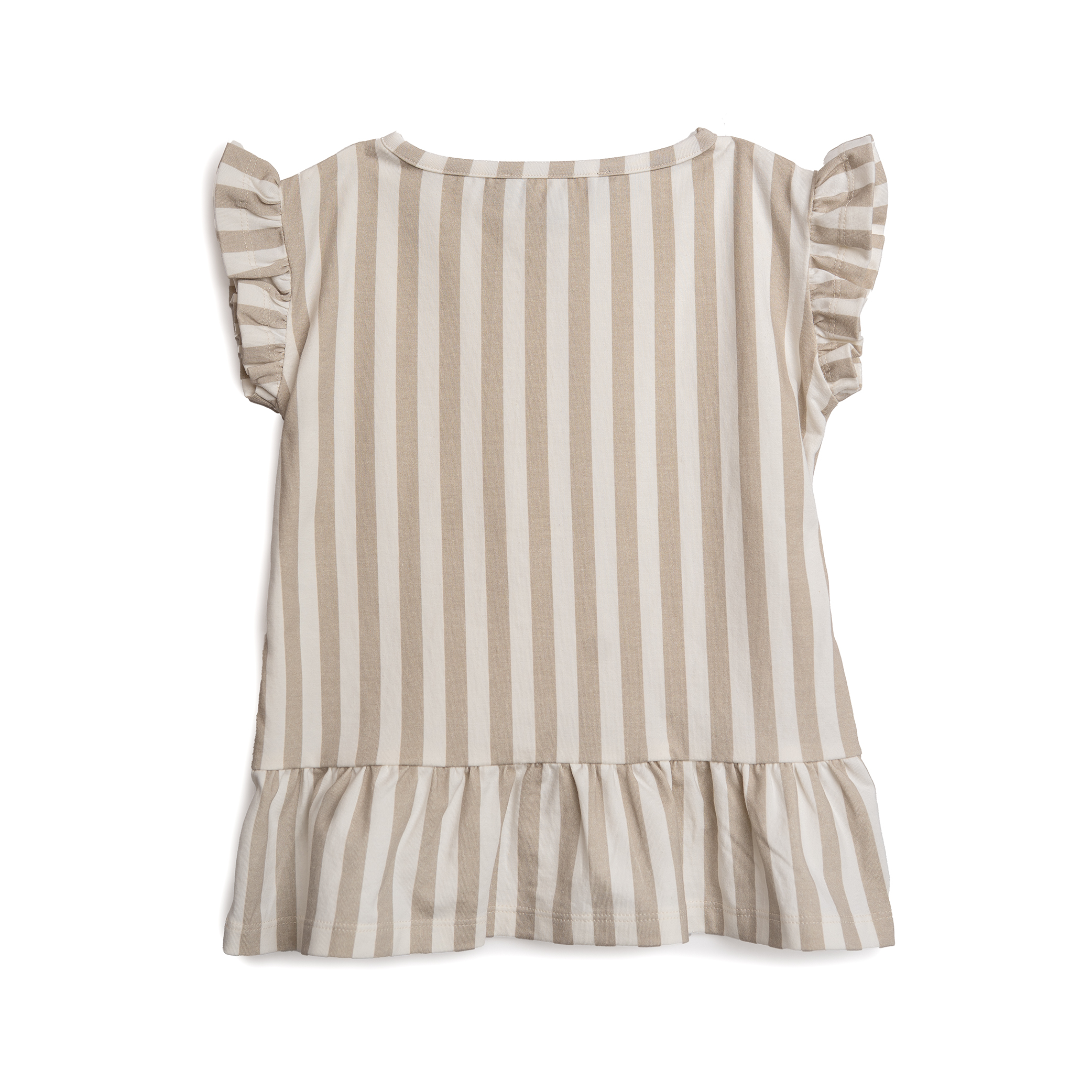 Dies ist eine ärmelloses Shirt für Kinder von Hanevild. Das Shirt zeigt durchgehend ein Streifenmuster, das eine dezente dekorative Textur verleiht. Er hat einen runden Ausschnitt mit Rippenkante und zwei Holzknöpfe vorne für ein einfaches Anziehen. Das herausragende Detail sind die gerüschten Ärmel, die dem Shirt eine charmante und feminine Note verleihen. Ideal, um sie in Schichten zu tragen oder an wärmeren Tagen allein zu tragen.