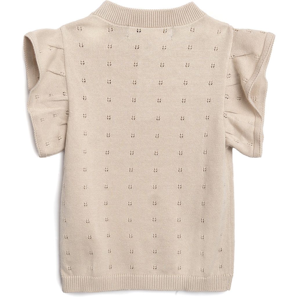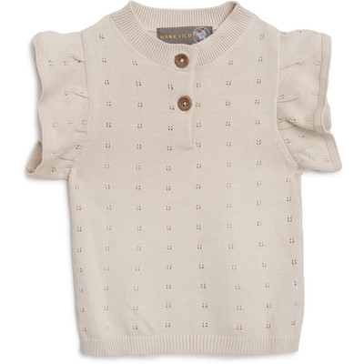Dies ist eine ärmellose gestrickte Weste für Kinder von Hanevild. Sie besteht a us weichem, organischem Material in einem hellbeigen Farbton. Die Weste zeigt durchgehend ein zartes Pointellemuster, das eine dezente dekorative Textur verleiht. Er hat einen runden Ausschnitt mit Rippenkante und zwei Holzknöpfe vorne für ein einfaches Anziehen. Das herausragende Detail sind die gerüschten Ärmel, die der Weste eine charmante und feminine Note verleihen. Ideal, um sie in Schichten zu tragen oder an wärmeren Tagen allein zu tragen.