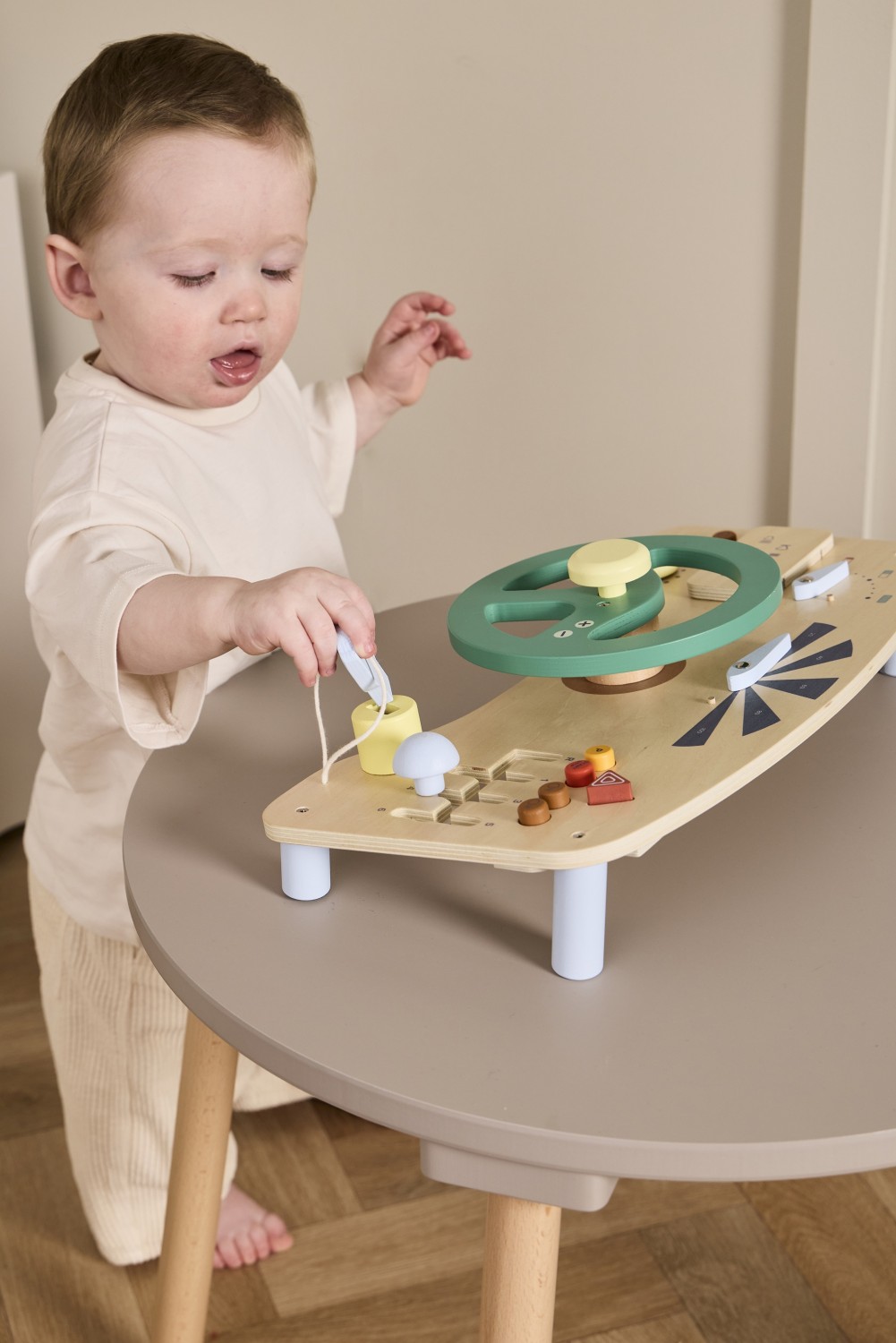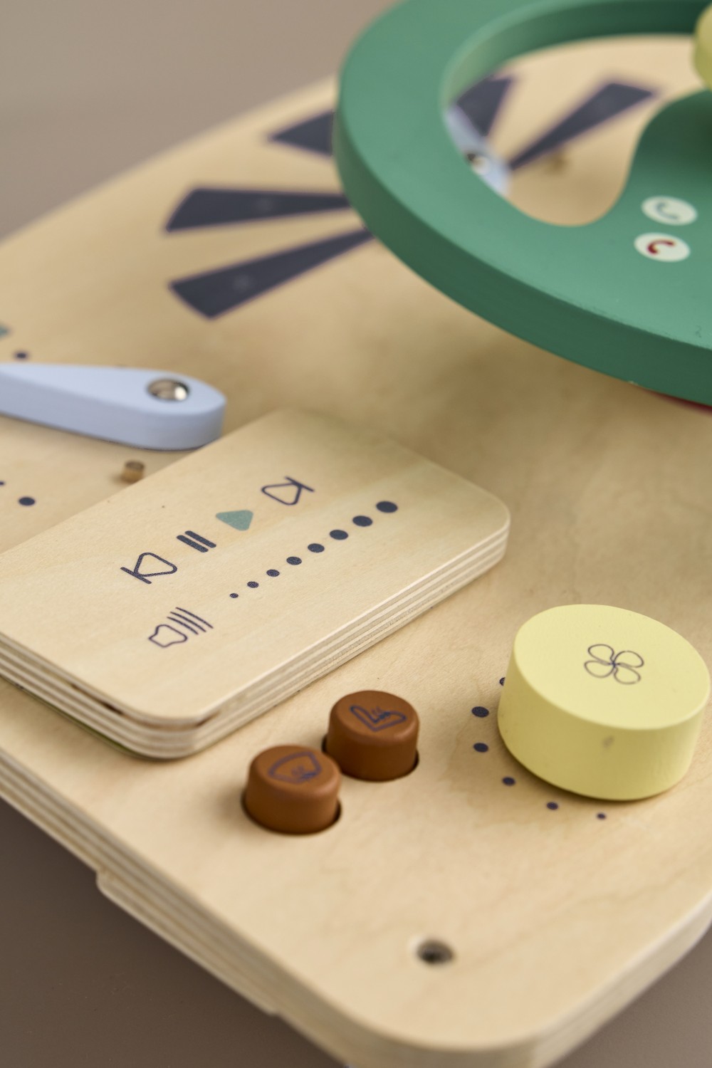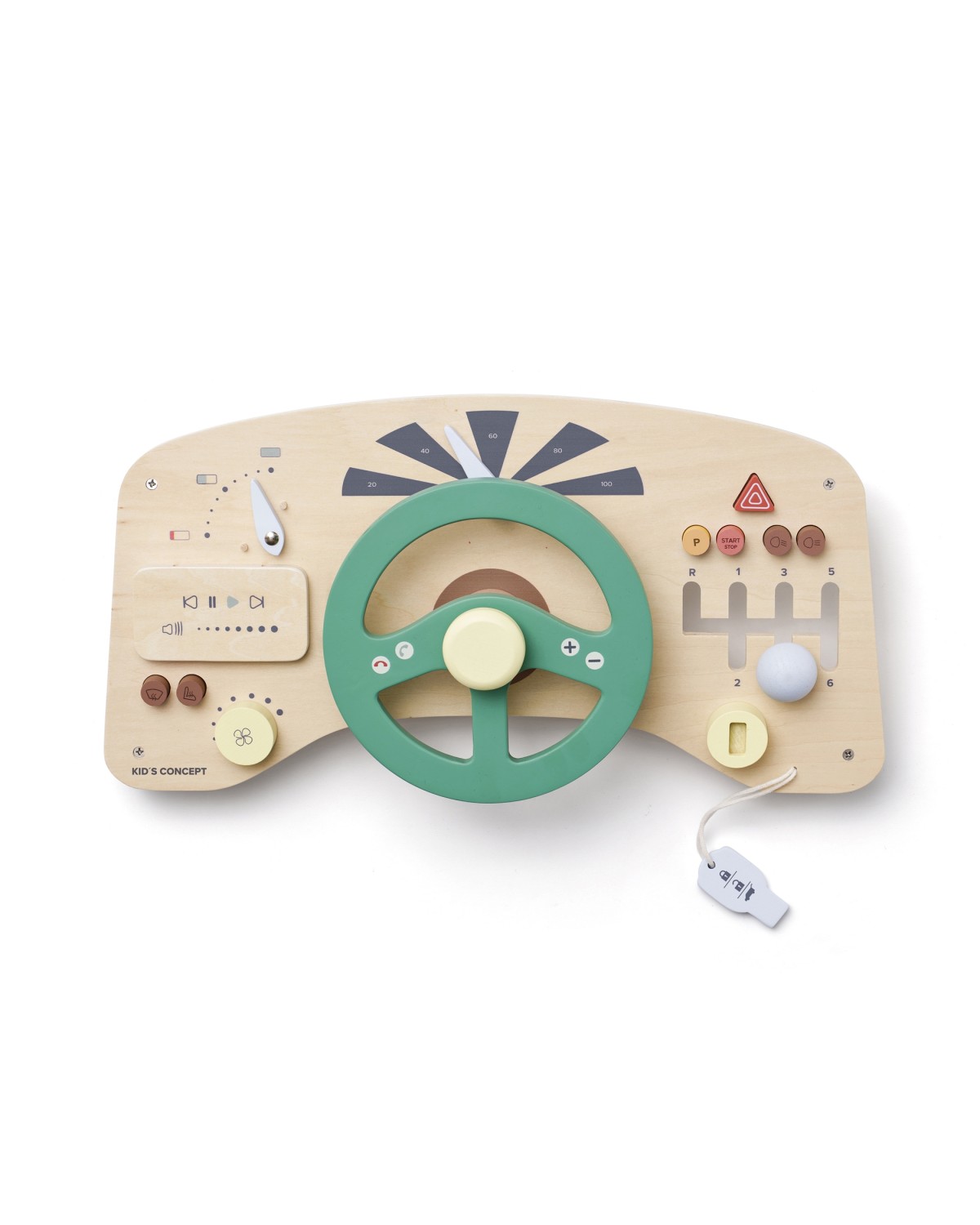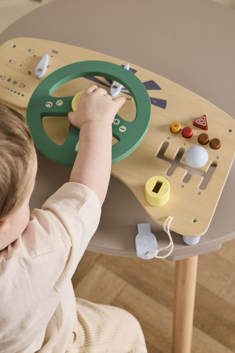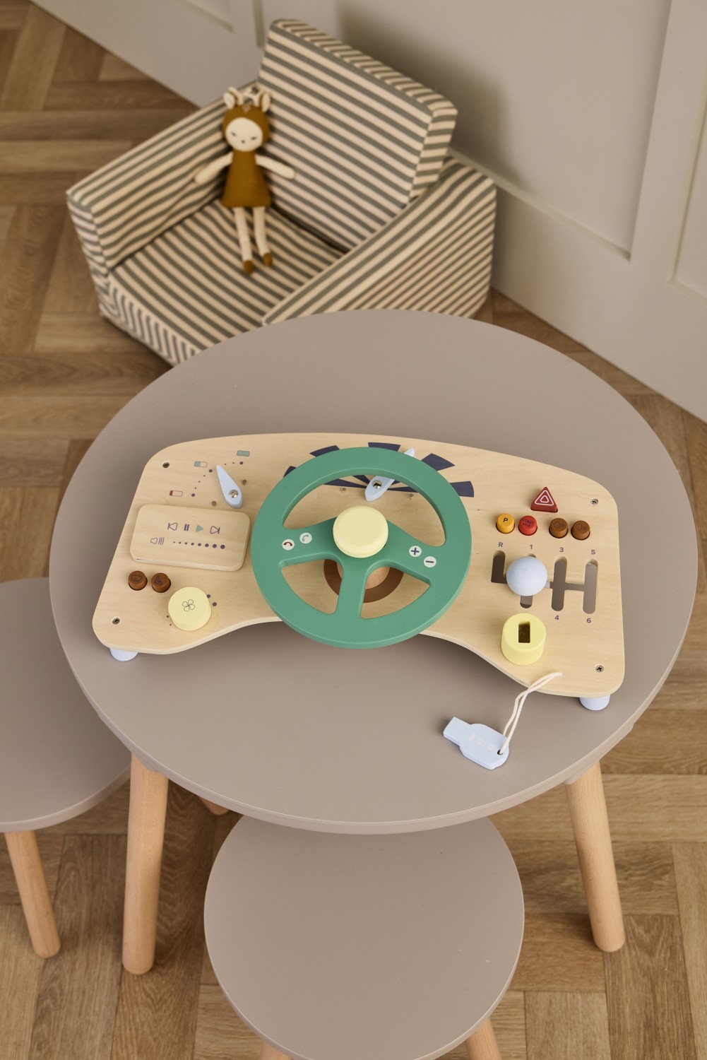 Mit diesem hölzernen Fahrspielbrett aus FSC-zertifiziertem Holz kann Ihr Kind das Steuer übernehmen und den Spaß am Fahren seines eigenen „Autos“ entdecken. Mit einem Lenkrad zum Drehen, einem „GPS“ zum Befolgen von Richtungen und einem Schlüssel zum Starten des Motors steht den kleinen Fahrern eine spannende Fahrt bevor. Das Board verfügt außerdem über eine Hupe am Lenkrad, Drucktasten, einen Tachometer und eine Batteriestandsanzeige, die für ein aufregendes Fahrerlebnis sorgen.