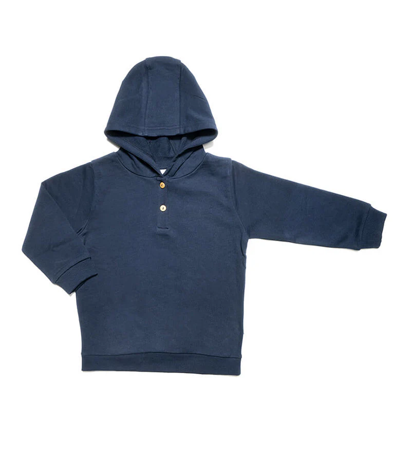 Bequemer Sweathoodie aus 100% Bio-Baumwolle (kbA) in einem mitternachts Indigo, kombiniert mit Rippbündchen an dem Bauch sowie an den Ärmeln. Besonders hautfreundlich und angenehm zu tragen, mit einem Holzknopfverschluss.