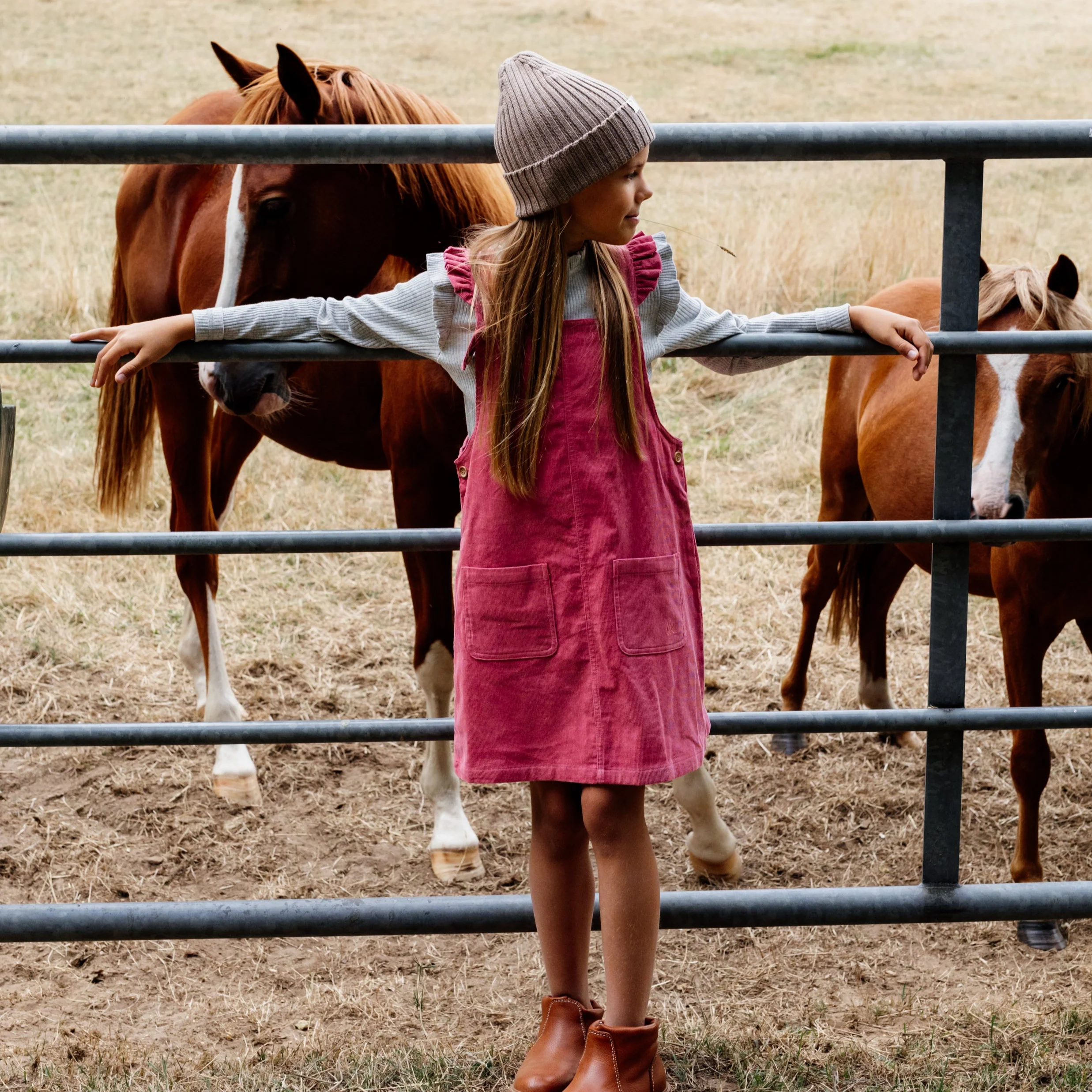 „Dieser Latzrock aus weichem Feincord ist ein toller Begleiter für das ganze Jahr. Die Träger sind in der Länge verstellbar und sind mit süßen Rüschen versehen. Der Rockteil hat zwei Fronttaschen für kleine Kostbarkeiten.