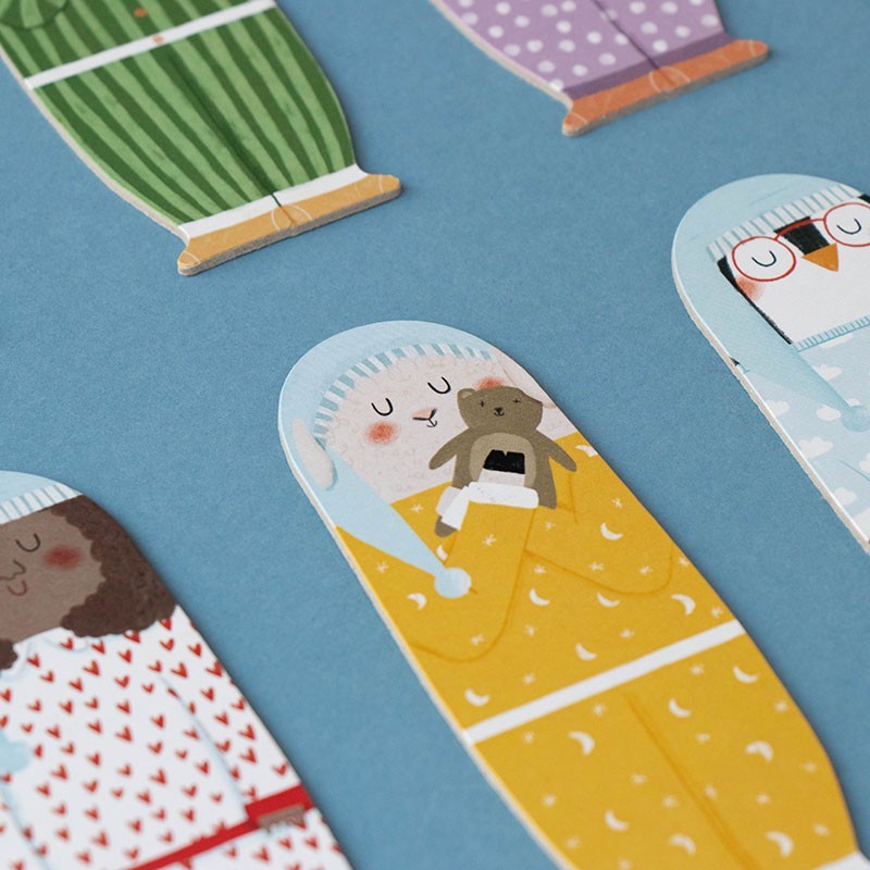 Unsere traumhaften Freunde schlafen ein. Wer trägt denselben Schlafanzug? Wer schläft in meinem Haus? Wo ist das Monster unter dem Bett? Gute Nacht!