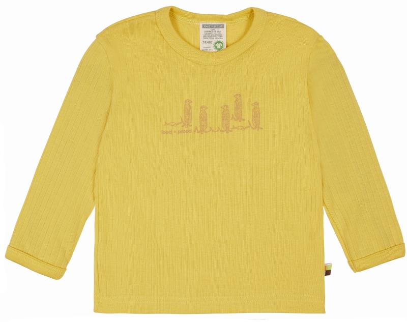 Shirt aus weichem Single Jersey mit eingstrickten feinen Streifen. Vorne aufgedrucktes Tiermotiv. Bis Größe 86/92 linke Schulter mit verdecktem Druckknopfverschluß. Fähnchen an der Seitennaht. Made in Hungary. Waschbar bei 30°C.