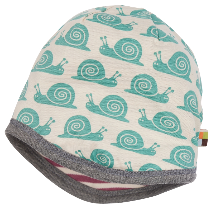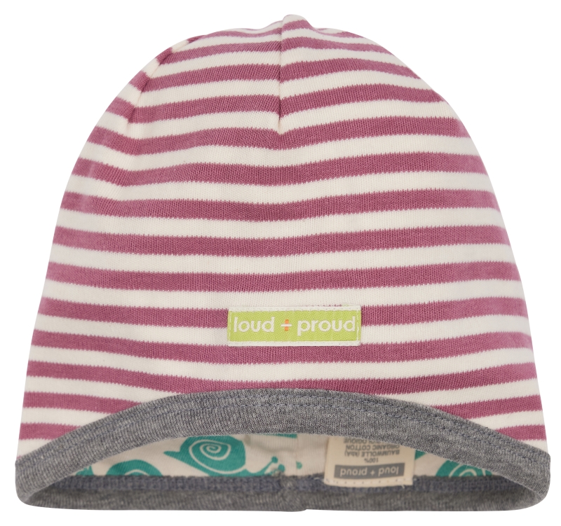 Weiche Wendemütze. Eine Seite ist aus bedrucktem Jersey, die andere Seite aus geringeltem Interlock gefertigt. Die Kante ist kontrastfarbig eingefasst. Vorne Logo-Etikett, hinten mit Fähnchen. Made in Hungary. Waschbar bei 30°C