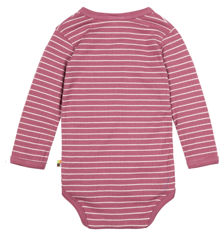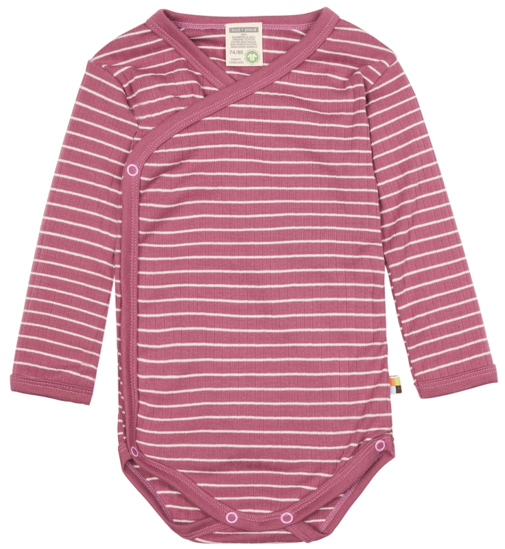 Geringelter Wickelbody aus weichem Jersey. Schrittverschluss mit 2 Druckknöpfen. Fähnchen an der Seitennaht. Made in Hungary. Waschbar bei 30°C.