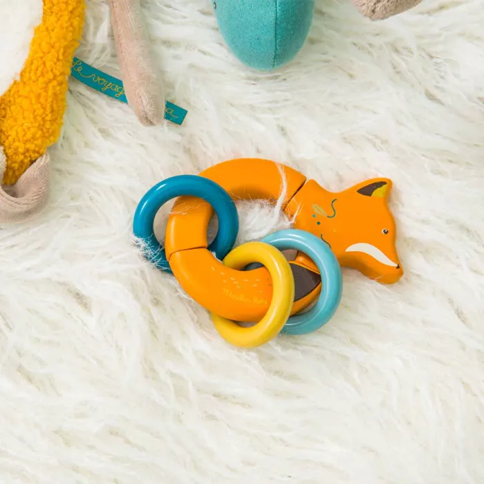 Rassel/ Greifling aus Holz. Ideal für die Entwicklung der Fähigkeit, einen Gegenstand zu greifen. Flexibel durch Gummiband in der Rassel