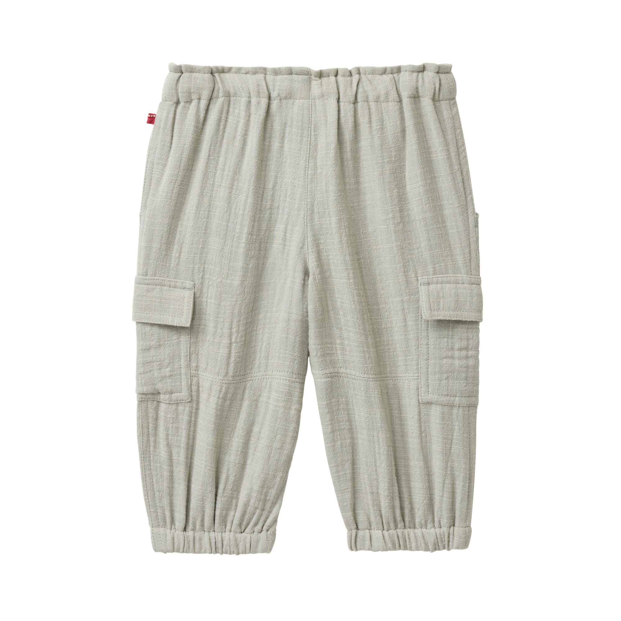 People wear organic nachhaltige und kuschelig weiche Cargohose aus Musselin für Mädchen und Jungen aus Bio Baumwolle in khaki.
