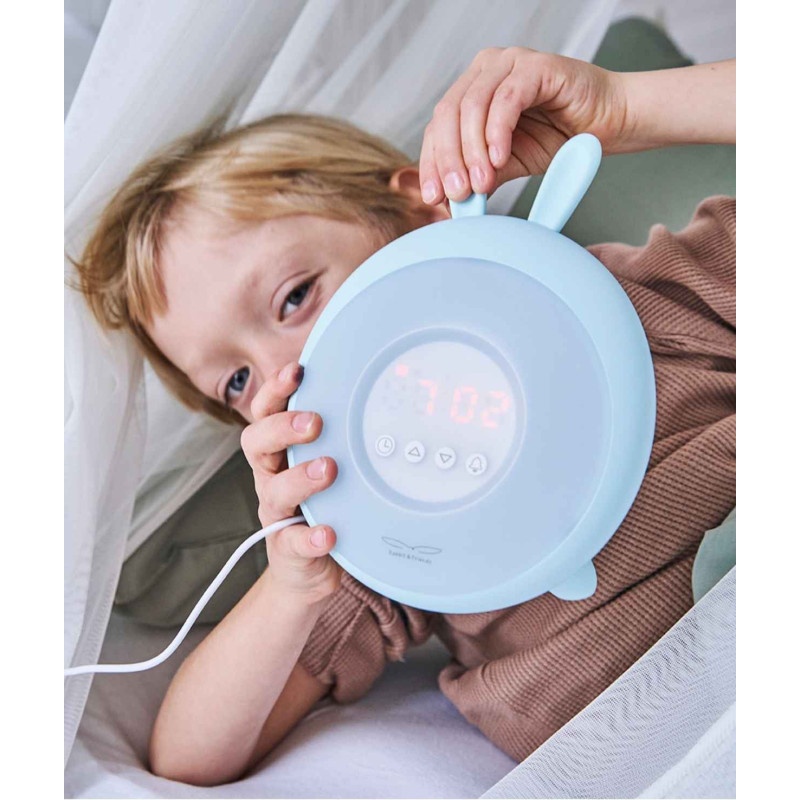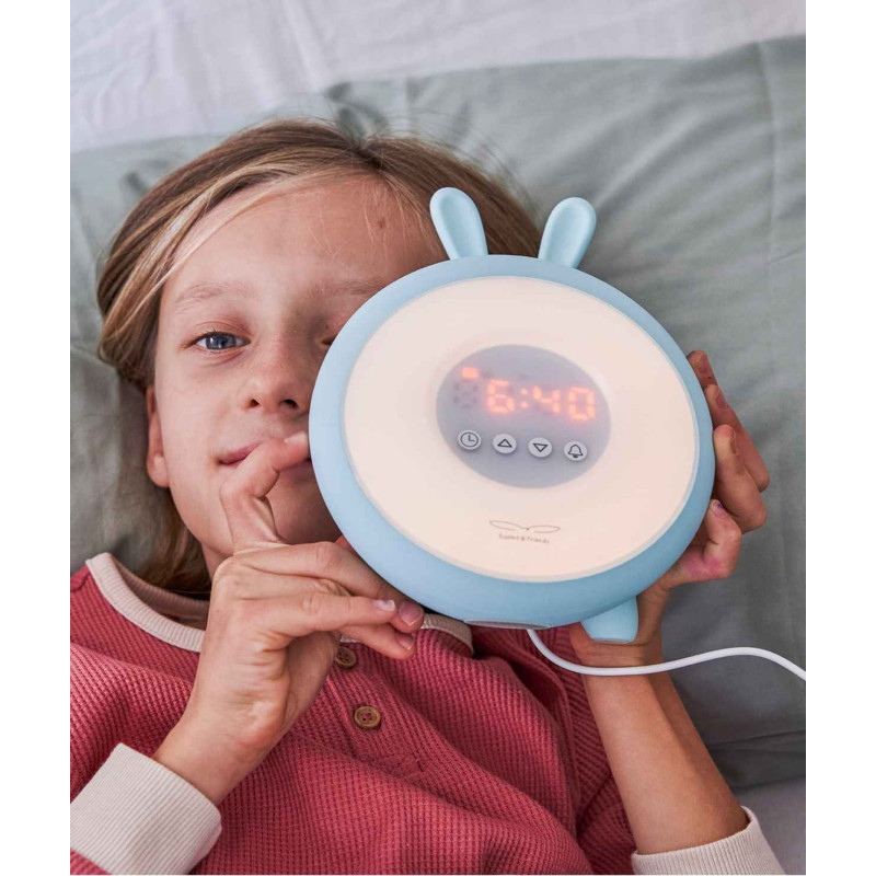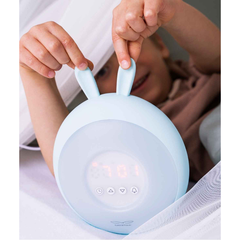 Die Rabbit Wake Up Lamp von Rabbit & Friends mit lustigen Ohren wacht langsam mit sanftem Licht und Naturgeräuschen auf und dimmt am Ende des Tages allmählich das Licht, wenn es Zeit zum Schlafen ist. Es hilft, den natürlichen zirkadianen Rhythmus zu regulieren und wirkt sich positiv auf Gesundheit und Wohlbefinden aus.