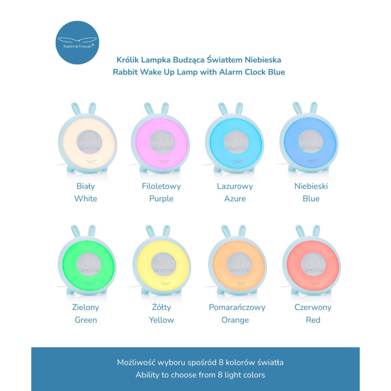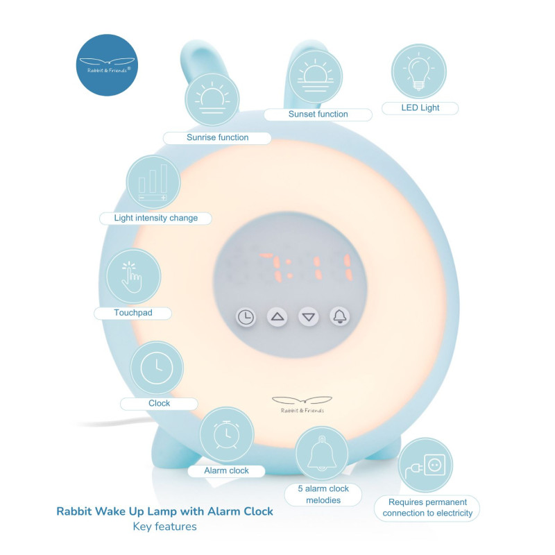 Die Rabbit Wake Up Lamp von Rabbit & Friends ist ein praktisches Gerät, das das tägliche Aufwachen und Einschlafen unterstützt, den natürlichen zirkadianen Rhythmus reguliert und das Wohlbefinden positiv beeinflusst. Die Sonnenaufgangsfunktion wird 30 Minuten vor dem Hauptalarm aktiviert – die Lampe erhöht allmählich die Lichthelligkeit und ahmt so einen natürlichen Sonnenaufgang nach. Dies ermöglicht ein sanftes und stressfreies Erwachen. 15 Minuten vor dem Wecker spielt ein Ton mit 50 % Lautstärke ab und hilft sanft beim Aufwachen. Für diejenigen, die mehr Zeit benötigen, steht die Schlummerfunktion zur Verfügung. Während des Einschlafens aktiviert die Lampe die Sonnenuntergangsfunktion, die das Licht über 30 Minuten allmählich dimmt und so zum Entspannen und Einschlafen beiträgt. Fünf Alarmmelodien stehen zur Auswahl, darunter zwei Naturgeräusche, die eine angenehme Atmosphäre zum Aufwachen schaffen. Die Lampe bietet eine einstellbare Lichtintensität und acht Farben zur Auswahl, die eine Anpassung an individuelle Vorlieben ermöglichen. Der weiche Korpus und die Hasenohren machen die Lampe sicher und angenehm im Griff, ideal für Kinder und gleichzeitig perfekt für alle, die ein sanftes Aufwachen bevorzugen. Das Gerät benötigt eine ständige Stromversorgung (Micro-USB-Kabel und Stecker im Lieferumfang enthalten). Das Produkt erfüllt die CE- und RoHS-Sicherheitsstandards und gewährleistet so eine hohe Qualität und sichere Verwendung.