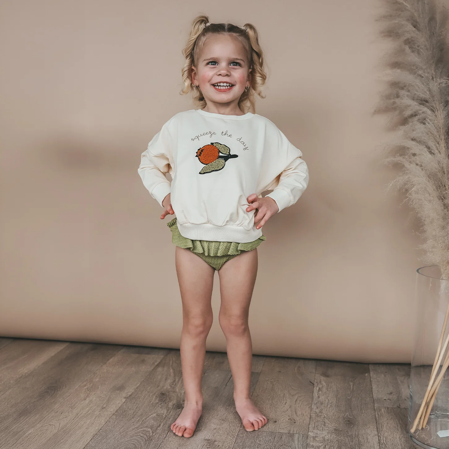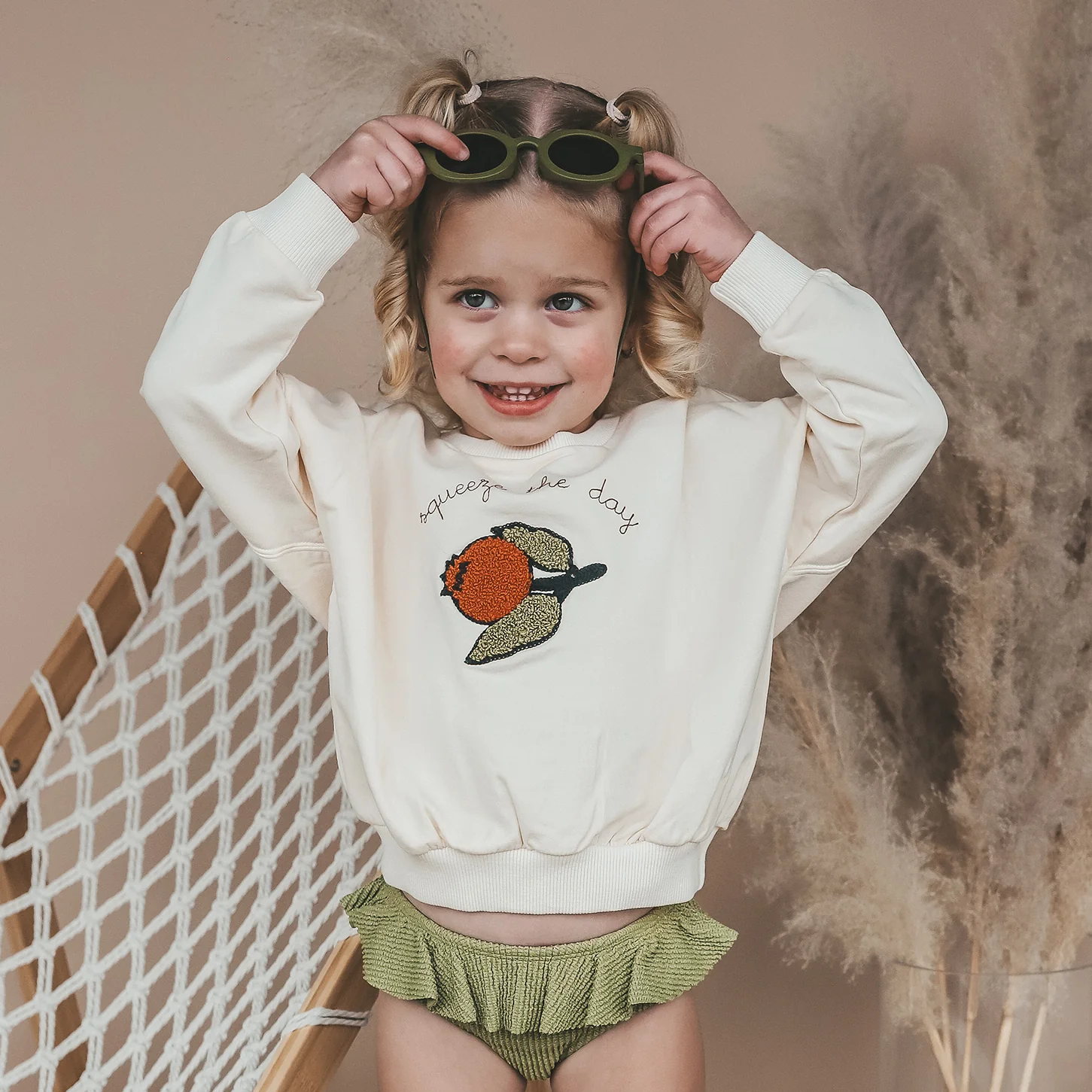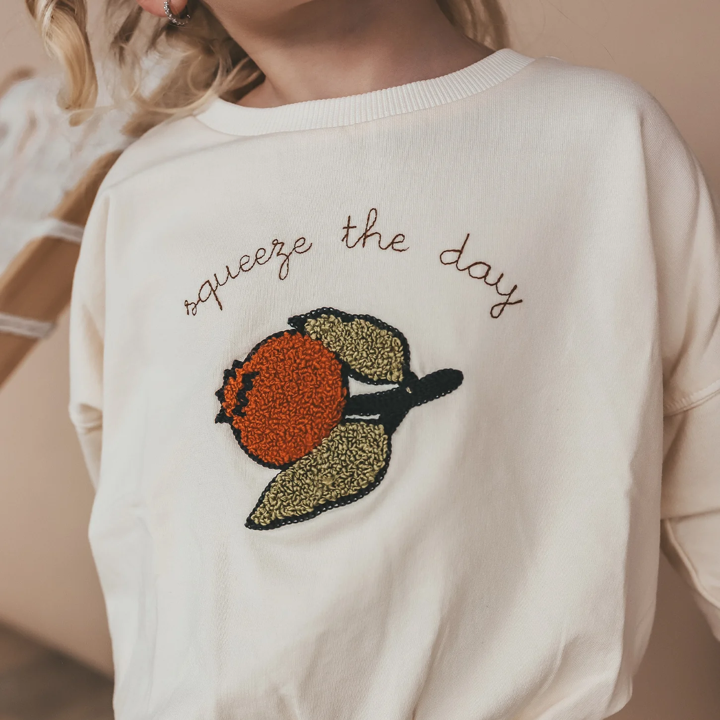 Dieser übergroße Pullover von Salted Stories verbindet Komfort mit einem verspielten, sommerlichen Look. Auf der Brust befindet sich ein bestickter Granatapfel mit der Aufschrift „squeeze the day“ – eine Anspielung auf sonnige Tage und das ultimative Feiertagsgefühl. Der Pullover hat eine übergroße Passform mit heruntergefallenen Schulternnähten, was einen lässigen und modernen Look verleiht. Die weiche Stoffqualität fühlt sich angenehm auf der Haut an und macht dieses Produkt perfekt für kühlere Morgen, lange Strandabende oder kühle Frühlingstage. Die gerippten Manschetten an Ärmeln, Hals und Unterseite sorgen für ein wunderschönes Finish und eine perfekte Passform. Dank des zeitlosen Farbeinsatzes lässt sich der Pullover leicht mit Shorts, Leggings, einem Rock oder über einem Kleid aus der Kollektion kombinieren.