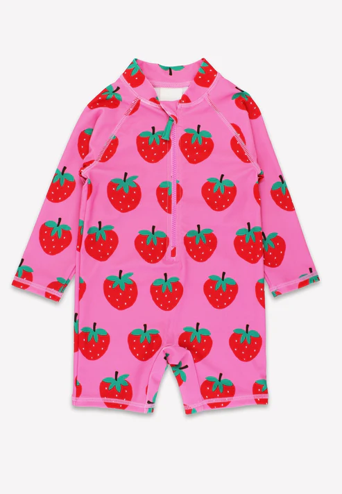 Schütze dein Kleines vor der Sonne und sorge gleichzeitig für einen süßen Look mit unserem langärmeligen Baby-Schwimmanzug im Erdbeer-Allover-Print. Aus umweltfreundlichen Materialien gefertigt, überzeugt der Schwimmanzug mit fröhlichem Muster und bietet zuverlässigen UV-Schutz mit UPF 50+.